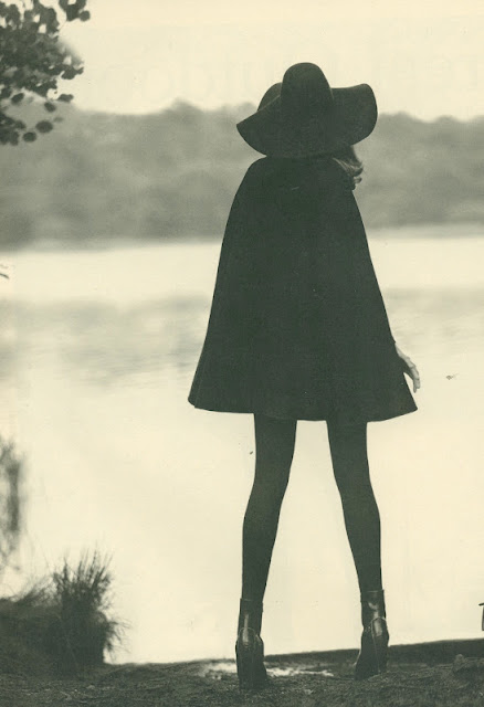 | black wool cape coat by Lanvin over a black cotton bodysuit by Balmain. high-heeled boots by Jil Sander. floppy hat by Lanvin |
